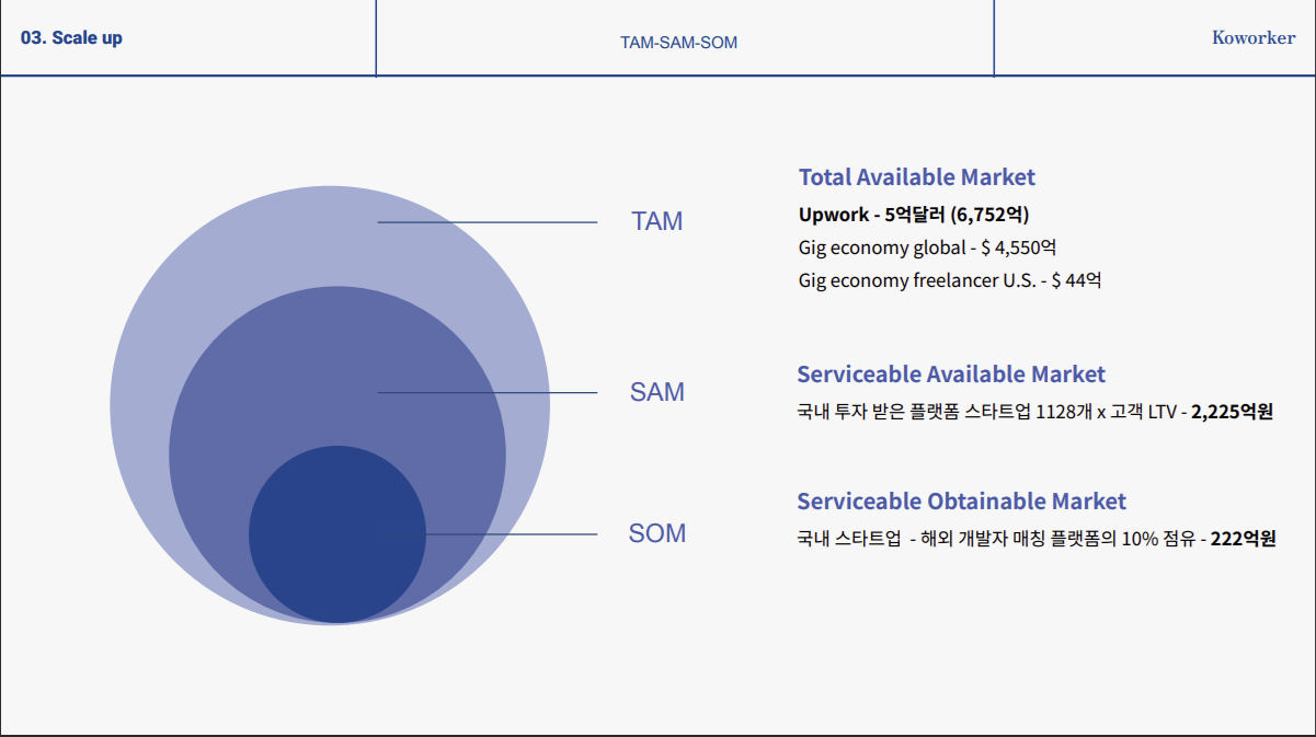 점은 TAM은 정확하지만 SAM-SOM에서 그 규모를 파악하기가 몹시 어렵다는 점이다. 애초에 국내 긱-이코노미 프리랜서